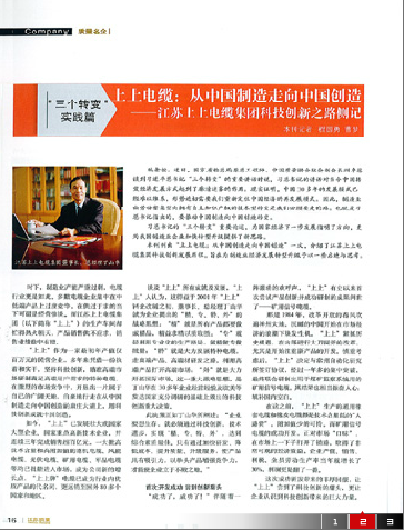 本刊刊出“上上電纜:從中國制造走向中國創(chuàng)造”一文,介紹了江蘇上上電纜集團(tuán)科技創(chuàng)新發(fā)展歷程,旨在為制造業(yè)經(jīng)濟(jì)發(fā)展轉(zhuǎn)型升級予以一些的啟迪與思考。