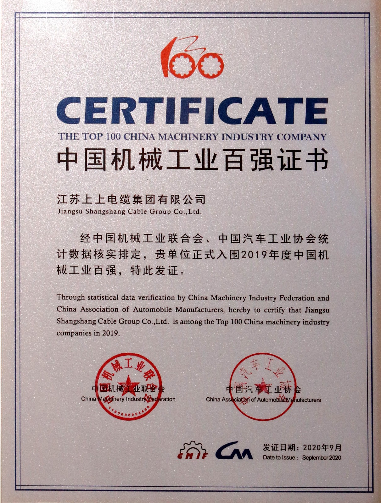 2020年9月16日,由中國機(jī)械工業(yè)聯(lián)合會(huì)、中國汽車工業(yè)協(xié)會(huì)聯(lián)合主辦的第十六屆“中國機(jī)械工業(yè)百強(qiáng)、汽車工業(yè)整車二十強(qiáng)、零部件三十強(qiáng)企業(yè)信息發(fā)布會(huì)”在重慶銅梁召開。會(huì)上揭曉了2019年中國機(jī)械工業(yè)百強(qiáng)榜單,江蘇上上電纜集團(tuán)連續(xù)16年入選,位列第20位。