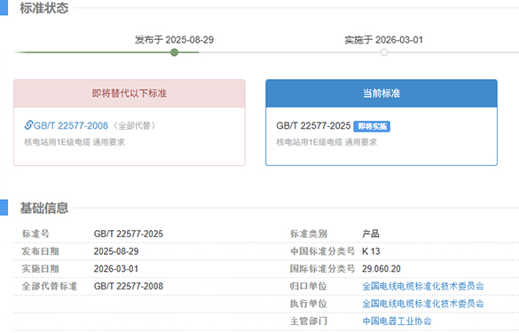 近日,國(guó)標(biāo)委發(fā)布公告,由江蘇上上電纜集團(tuán)有限公司、中國(guó)核電工程有限公司、生態(tài)環(huán)境部核與輻射安全中心、深圳中廣核工程設(shè)計(jì)有限公司、上海電纜研究所有限公司、上海核工程研究設(shè)計(jì)院股份有限公司、清華大學(xué)等核電監(jiān)管機(jī)構(gòu)、核電纜生產(chǎn)企業(yè)、核電設(shè)計(jì)院、核電運(yùn)行單位共同制定的GB/T 22577—2025《核電站用1E級(jí)電纜 通用要求》國(guó)家標(biāo)準(zhǔn)于2025年8月29日正式發(fā)布,將于2026年3月1日實(shí)施。